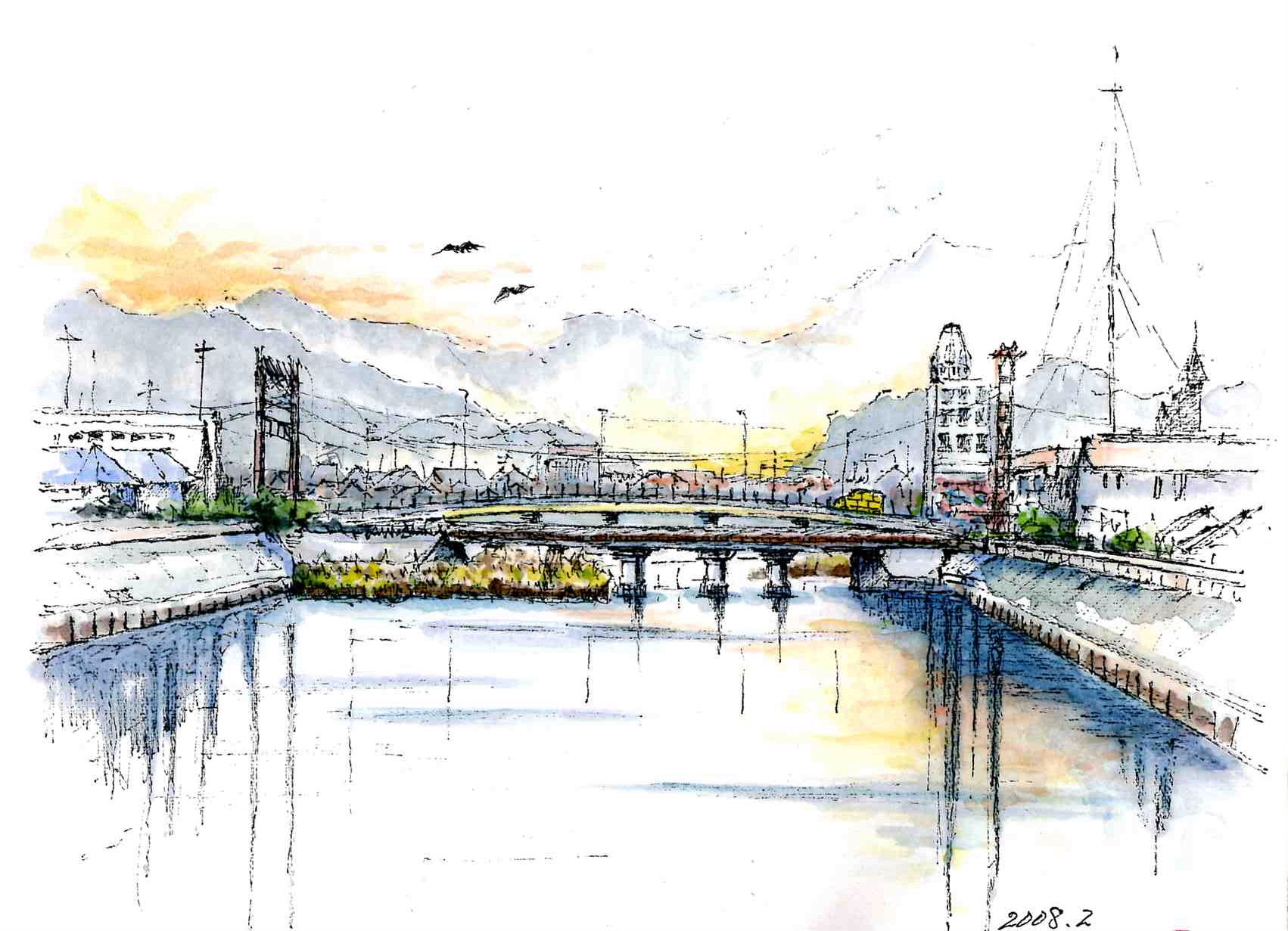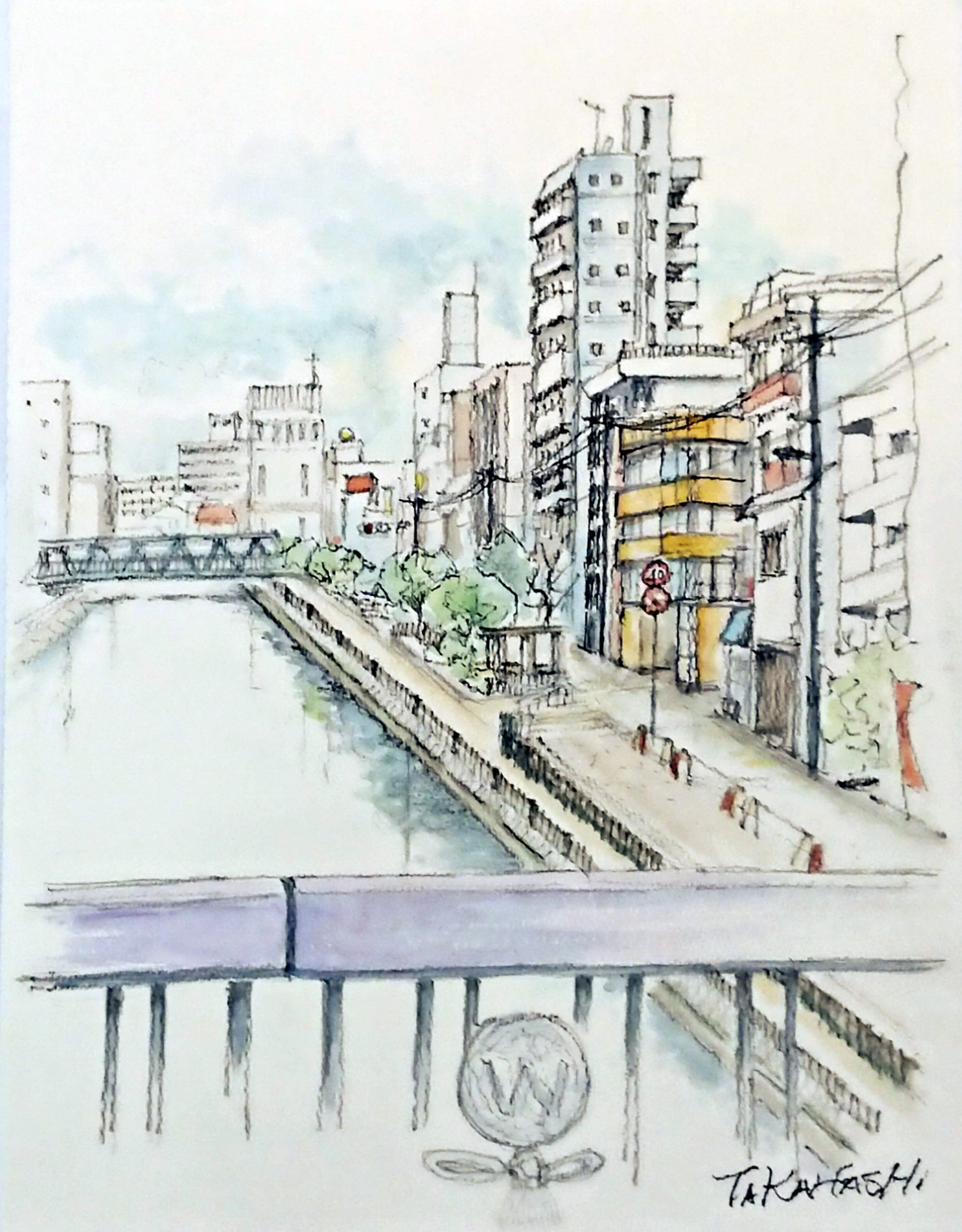 和歌山城のお堀を堀川と言います。 そこに架かっている橋から描きました。